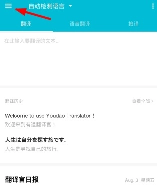 1、若要进行离线翻译,可点击页面左上角的横杠按钮,打开个人功能列表后再开展相关操作。