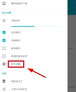 2、接着在功能列表中选择“更多设置”选项,如此便能进入离线数据包相关设置,进而启用离线翻译功能。