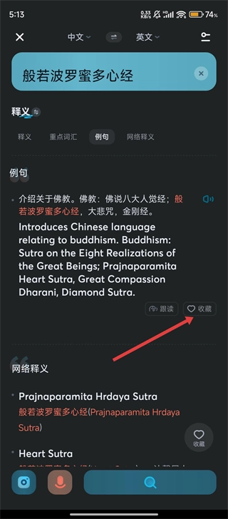 3、进入翻译详情页面后,点击【收藏】按钮,就能把这个句子收藏起来,这样日后回顾查看会更方便哦。