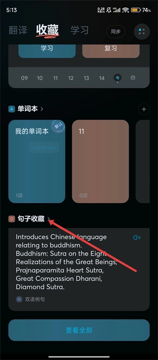 4、切换至【收藏】页面,点击【句子收藏】选项,即可查看已收藏的句子,便捷管理收藏内容。