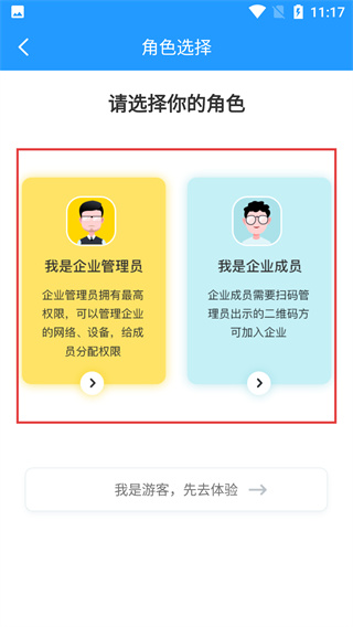4、登录后进入【角色选择】页,可选【我是企业管理员】(掌最高权限)或【我是企业成员】(扫码加入),也可选游客体验。