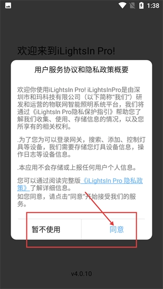 1、启动【iLightsIn Pro】应用后,仔细阅读【用户服务协议和隐私政策概要】,随后点击【同意】按钮,就能进入应用的登录界面。