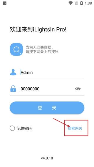 2、登录界面的默认账号是【Admin】,默认密码为【00000000】;若要查找对应的网关设备,可点击界面上的【搜索网关】按钮。
