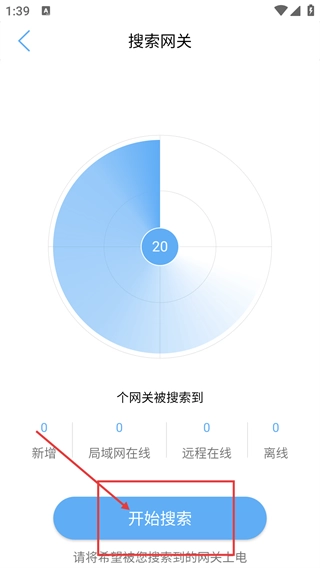 3、进入【搜索网关】页面,在确认网关已接通电源后点击【开始搜索】,系统将自动扫描并统计出可连接的网关设备数量。