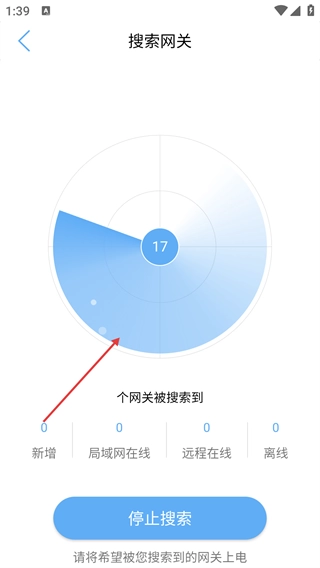 4、搜索过程中能看到进度圆环,完成后点击【停止搜索】,就能查看搜索到的网关状态(如新增、在线等)。