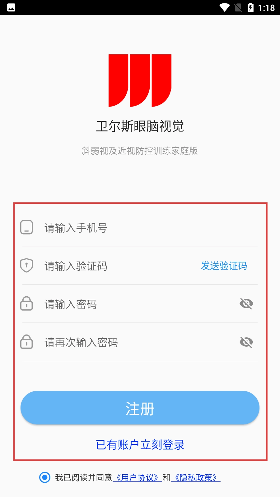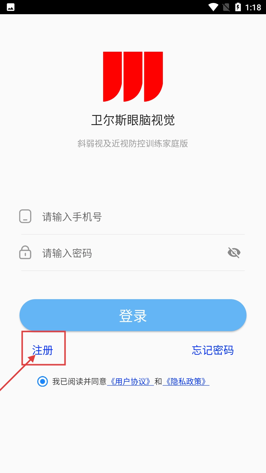 1、打开卫尔斯眼脑视觉,找到并点击【注册】按钮,即可进入注册页面。