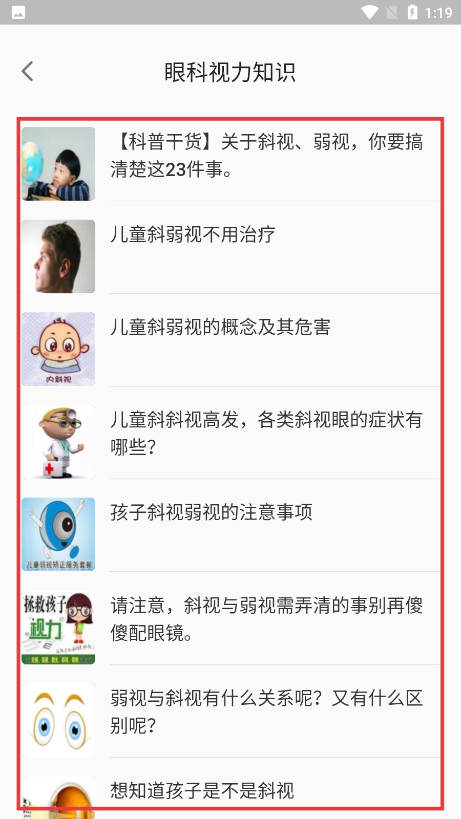 在眼科视力知识列表页面,用户能够挑选自己感兴趣的斜弱视相关科普文章来阅读,从而知晓斜弱视的相关知识以及需要注意的事项。