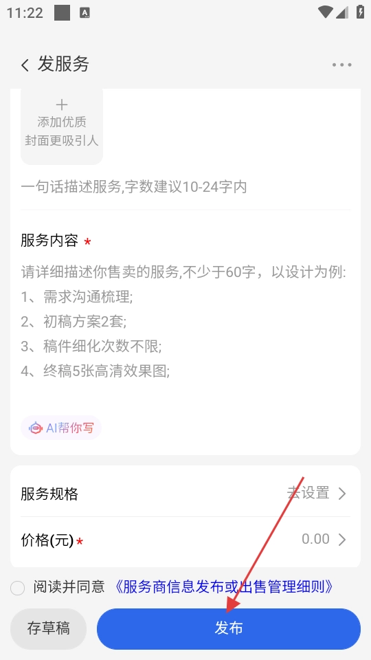 4、登录账号后,进入发服务页面,填写服务内容、价格等相关信息,随后点击【发布】按钮,就能完成服务发布。