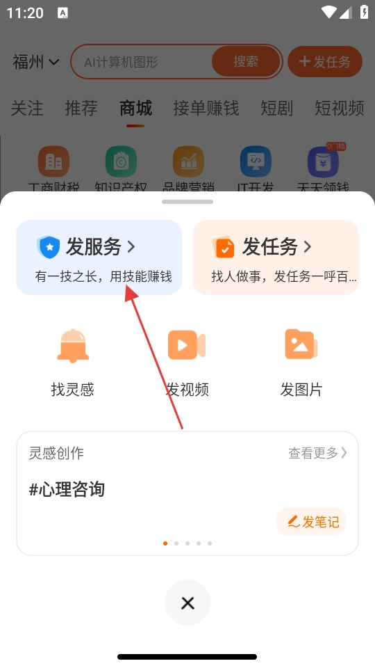 2、在功能选择区域,点击【发服务】选项,跳转至登录界面。