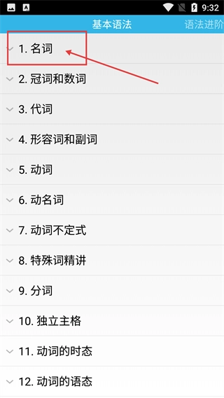 1、进入【基本语法】板块后,会呈现语法知识点的列表,点击【1.名词】就能展开该部分下的细分学习内容,大家可以按照模块循序渐进地学习语法知识。