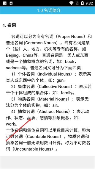 3、进入【1.0名词简介】页面,能够了解名词的分类情况:名词分为专有名词和普通名词,其中普通名词还包含个体、集体、物质、抽象这四类。
