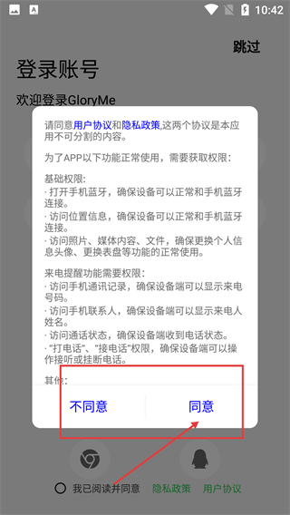 进入应用时会弹出权限与协议提示窗口,用户需要点击【同意】按钮,以此确认接受用户协议和隐私政策,并授予蓝牙、位置等必要的功能权限,完成这些操作后才能正常使用应用的各项功能。