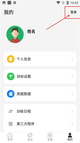 3、进入【我的】页面后,点击右上角的【登录】按钮就能打开账号登录界面,完成登录操作后,便可以同步运动数据以及管理个人信息。