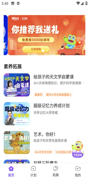 在首页能看到这样的界面,这里会展示素养扩展课程。