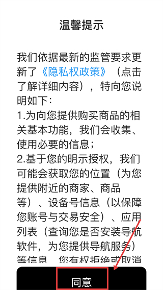 打开应用后,点击【同意】按钮以确认《隐私权政策》,从而完成权限与协议的确认流程。