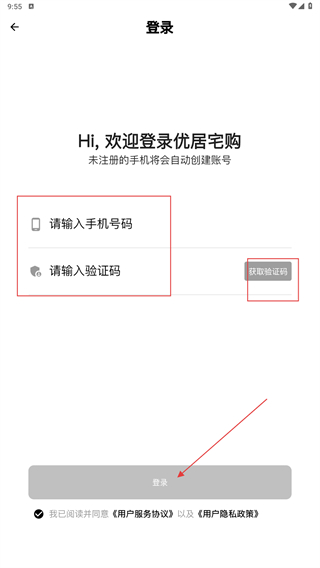 4、在登录页面,先输入手机号码,接着点击“获取验证码”按钮,待收到验证码后将其填入对应输入框,随后勾选相关协议并点击“登录”按钮,即可完成账号登录操作。