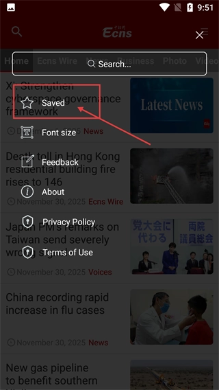 1、在【Ecns】应用的首页,点击右上角的菜单按钮,就能展开功能菜单,查看包含【Saved】在内的各项操作选项。