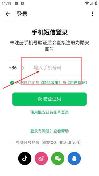 3、在手机短信登录页面填写手机号码,勾选相关协议后点击“获取验证码”,若该手机号尚未注册,系统将自动为其创建酷安账号。