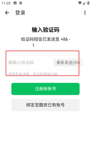 4、在验证码输入页面填写【请输入验证码】,之后选择【注册新账号】或者【绑定到酷安已有账号】,完成登录或注册操作。