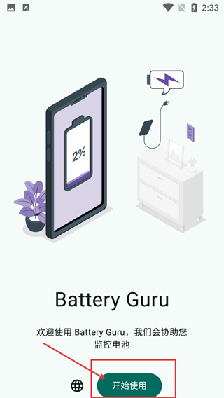 1、在【Battery Guru】的欢迎界面,这款应用能够帮助用户监控电池状态,点击【开始使用】按钮就能进入到后续的操作流程。