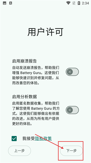 2、在【用户许可】页面,可选择开启【崩溃报告】-【分析数据】功能,勾选【我接受隐私政策】选项后,点击【下一步】按钮以推进流程。