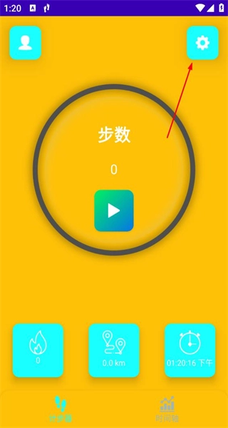1、启动软件进入主界面后,能看到步数显示为0,界面上还有播放按钮以及热量、距离、时间等相关信息,点击右上角的设置按钮即可进入设置页面。