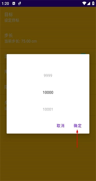 3、选择设定目标后会弹出数值选择框,将数值调整到10000,然后点击确定按钮,即可完成步数目标的设定。
