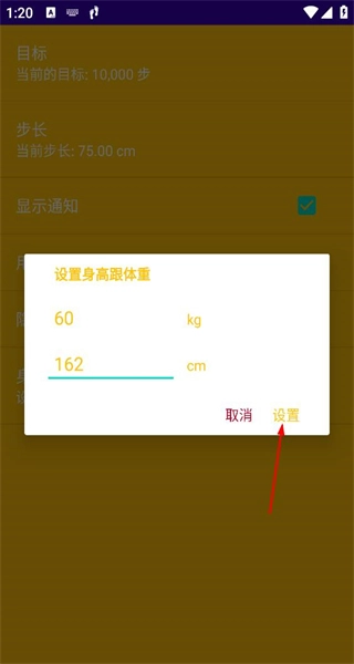 完成目标设定后,选择“设置身高和体重”选项,输入相应的数值,再点击设置按钮来保存这些信息。