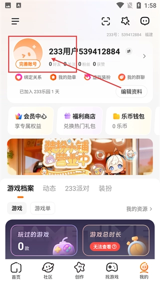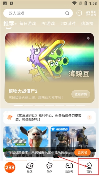 1、进入【233游戏】的首页后,点击底部导航栏里的【我的】选项,就能进入对应的个人中心页面,之后可以开展账号相关的操作。