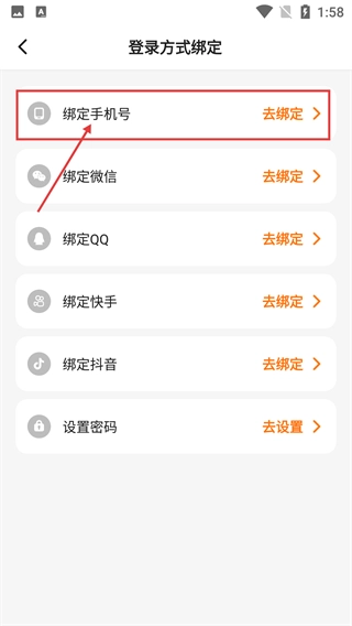 3、进入【登录方式绑定】页面后,找到【绑定手机号】选项,点击其右侧的【去绑定】按钮,即可跳转至手机号绑定页面。