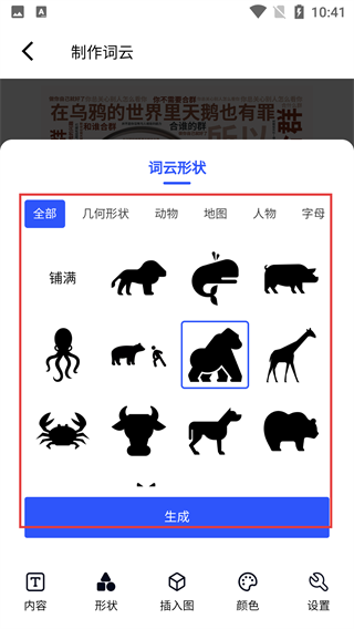 4、切换至【制作词云】的【形状】标签页,在【动物】等分类里挑选词云形状,选定后点击【生成】按钮,即可得到对应形状的词云。