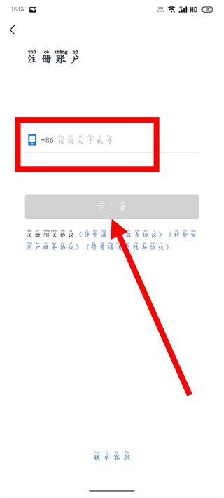 3进入账户注册界面后,在指定的输入区域填写您的手机号,接着点击页面上的“下一步”按钮。