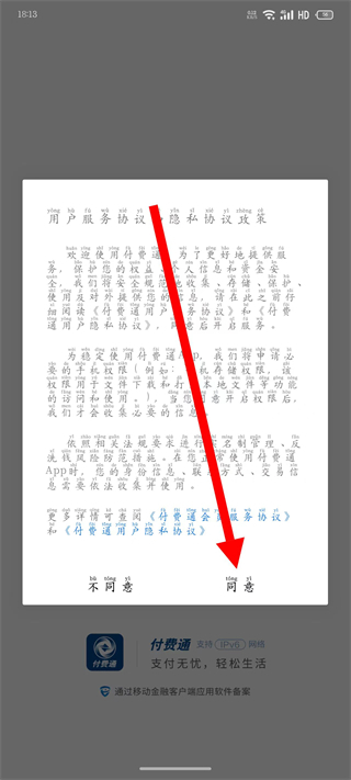 1首先启动付费通应用,当界面弹出包含服务条款与隐私说明的窗口时,选择确认接受相关内容。