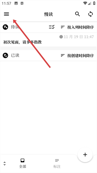 1、进入慢读界面,点击左上角的菜单按钮,打开功能侧边栏。