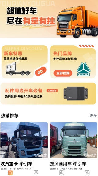有牵有挂是一款专业的二手挂车与牵引车在线交易平台。所有车辆均经过平台认证,价格透明合理,用户可以随时联系商家、对比车源,并享受安全保障服务与新用户专属优惠,实现省心购车、实惠交易。