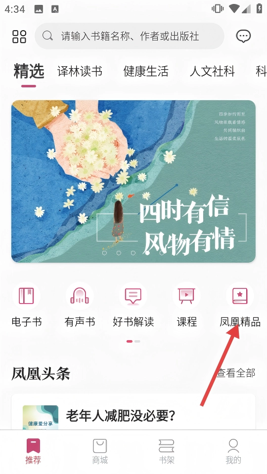 1、在推荐页点击【凤凰精品】,可进入课程推荐页面。