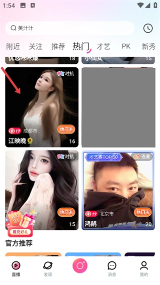 2、在【热门】板块里,找到主播【江映晚】的直播间并点击,就能进入观看直播了。