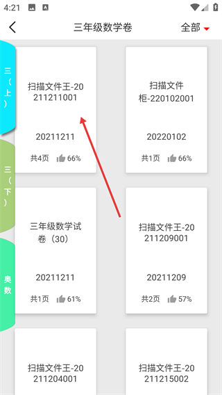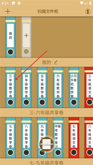 1、在扫描文件柜页面选择目标文件分类(如【三年级数学卷】),进入对应文件的列表页面。