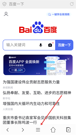 3、点击网页界面底部的功能按钮,展开包含书签等功能的操作菜单。