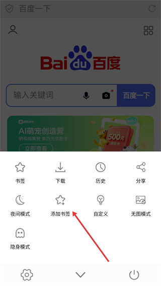 4、在操作菜单里点击【添加书签】选项,就能把当前网页存到浏览器的书签列表中,方便之后快速打开。