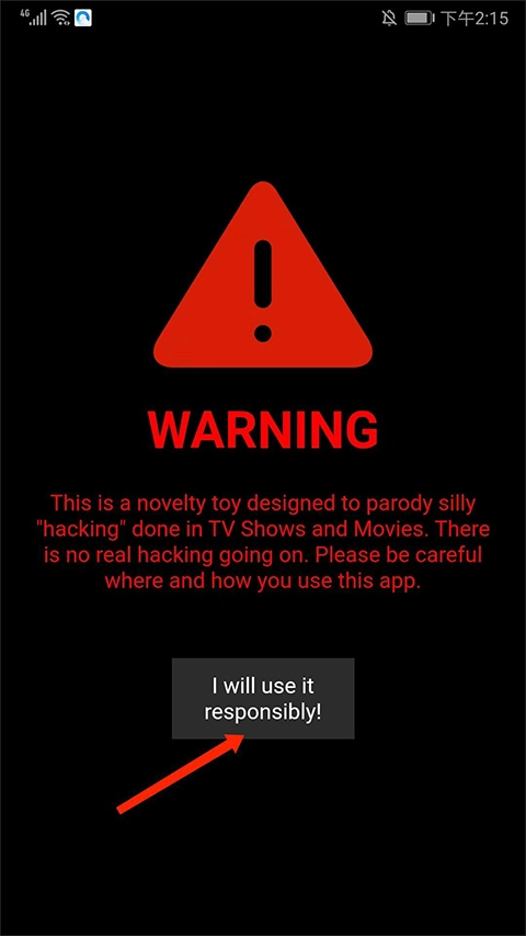 1、打开geektyper后,你会马上进入一个带有神秘感的黑色命令行界面,点击下方的【I will use responsiblly】提示就能进入主操作界面。