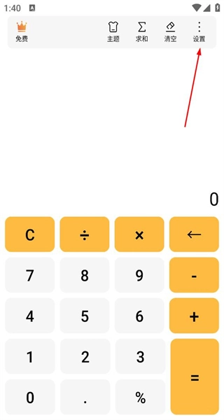 打开软件后,能看到计算按键以及顶部的免费主题等功能按钮,点击设置按钮即可进入对应的设置操作页面。