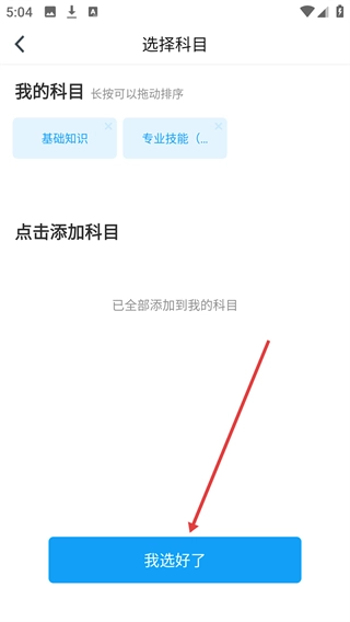 1、在包含【基础知识】【专业技能】的科目页面,确认科目已添加后,点击【我选好了】完成科目选择。
