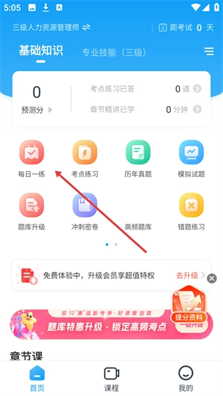 2、进入显示【三级人力资源管理师】的主界面,找到【每日一练】功能入口并点击,进入练习页面。