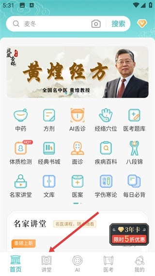 若您想学习中医课程,只需点击底部的【讲堂】按钮,就能进入知源中医的讲堂页面。