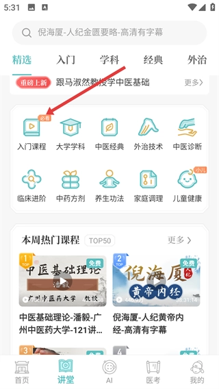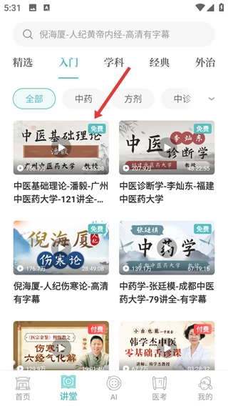 2、进入讲堂页面后,找到【入门课程】板块并点击进入,即可查看中医入门类的课程列表。