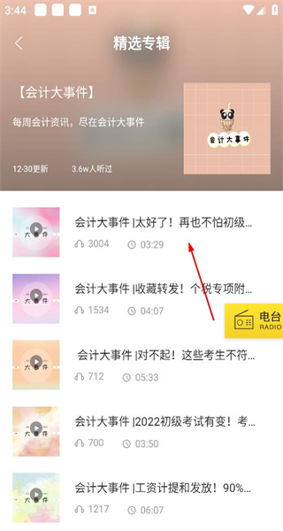 4、进入会计大事件专辑详情页,展示会计资讯类音频列表,各音频标注播放量与时长,选择对应音频开始收听资讯。