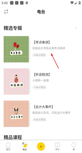 1、打开软件后,进入电台页面,精选专辑列考点串讲听说税讲会计大事件等内容,选择考点串讲专辑进入其详情页面。