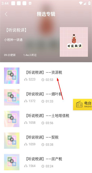 3、进入听说税讲专辑详情页,展示资源税烟叶税等税种音频,各音频标注播放量与时长,选择对应音频开始收听内容。