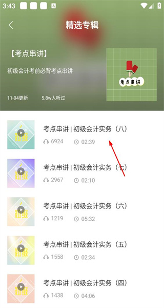 2、进入考点串讲专辑详情页,展示初级会计实务相关音频列表,各音频标注播放量与时长,选择对应音频即可开始收听。